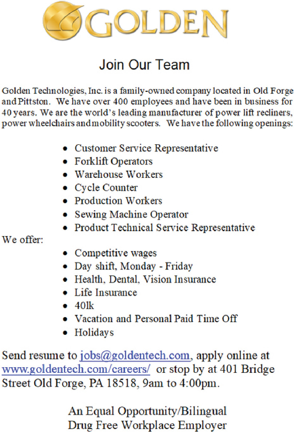 Jobs for Golden Technologies in Old Forge, PA
