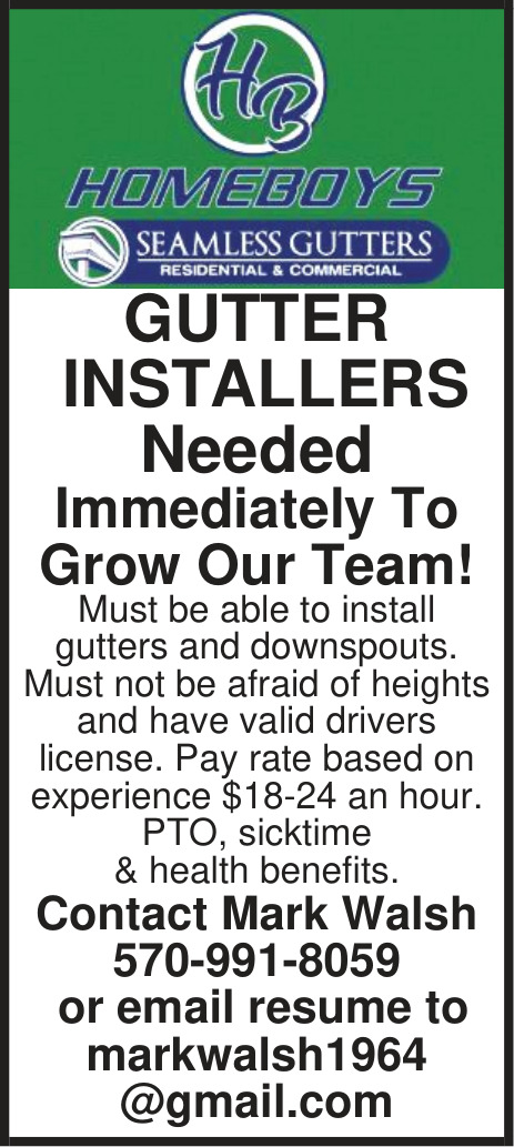 Apr 30, 2026. Homeboys Seamless Gutters - Mark Walsh Technicians Jobs from Wilkes Barre Careers